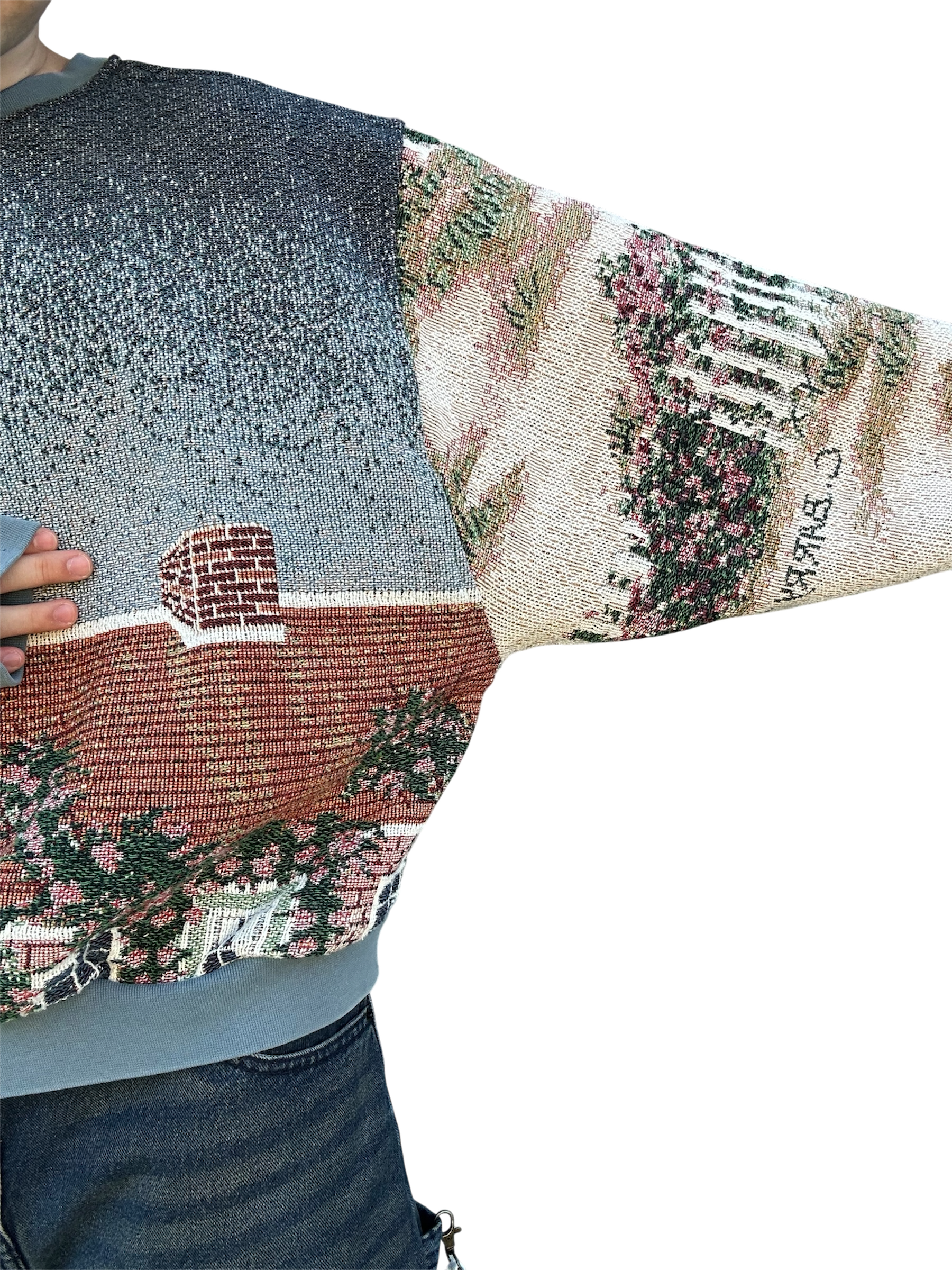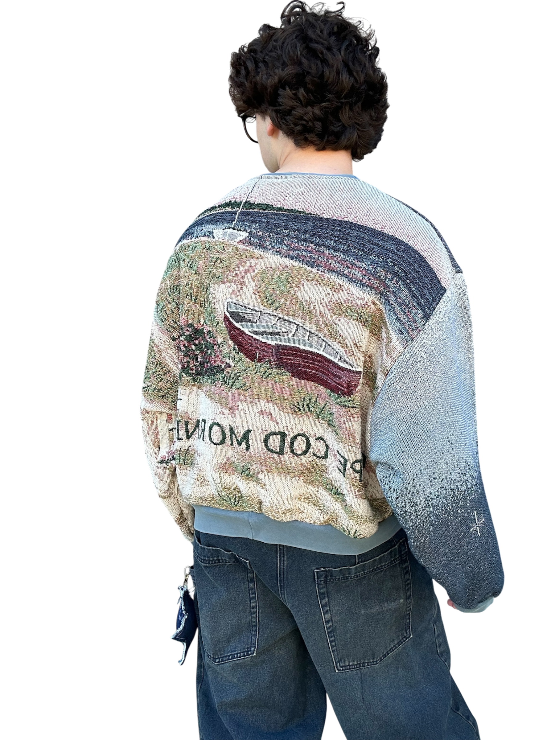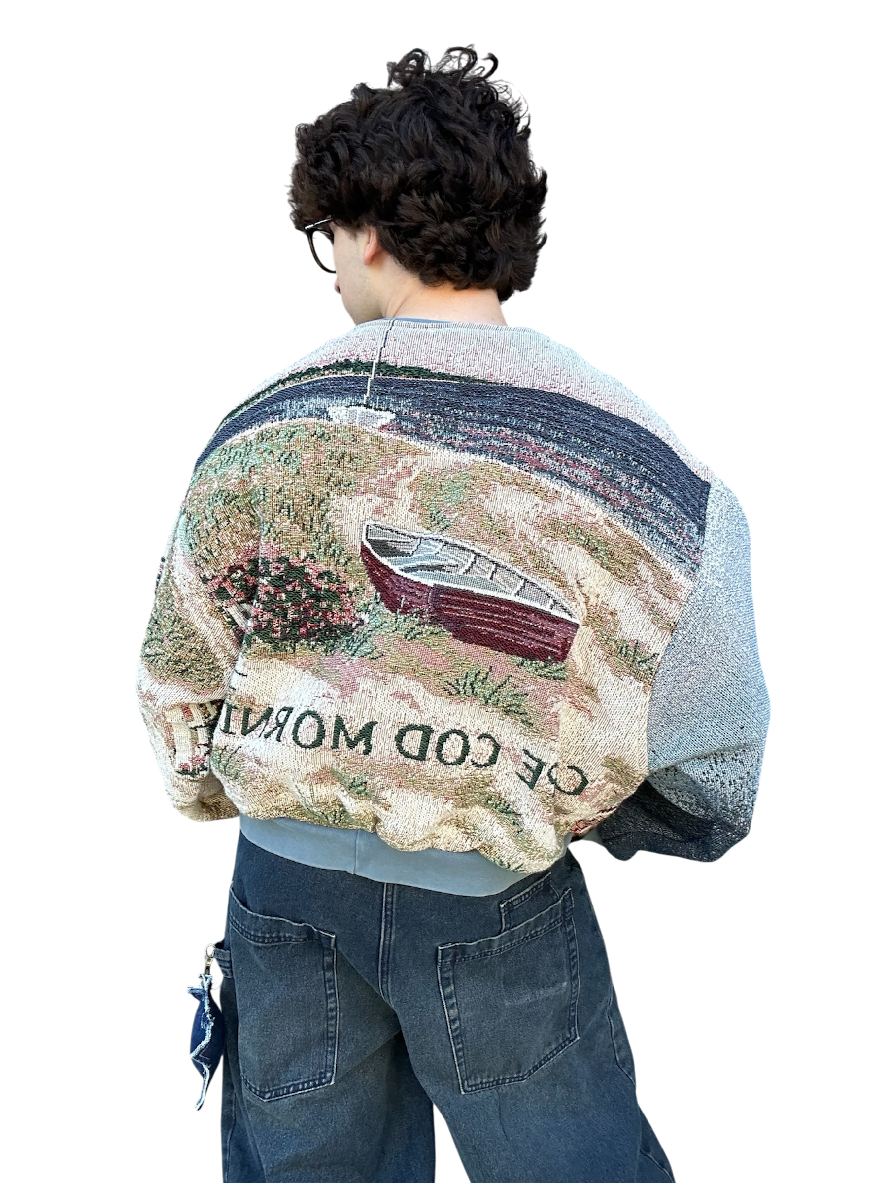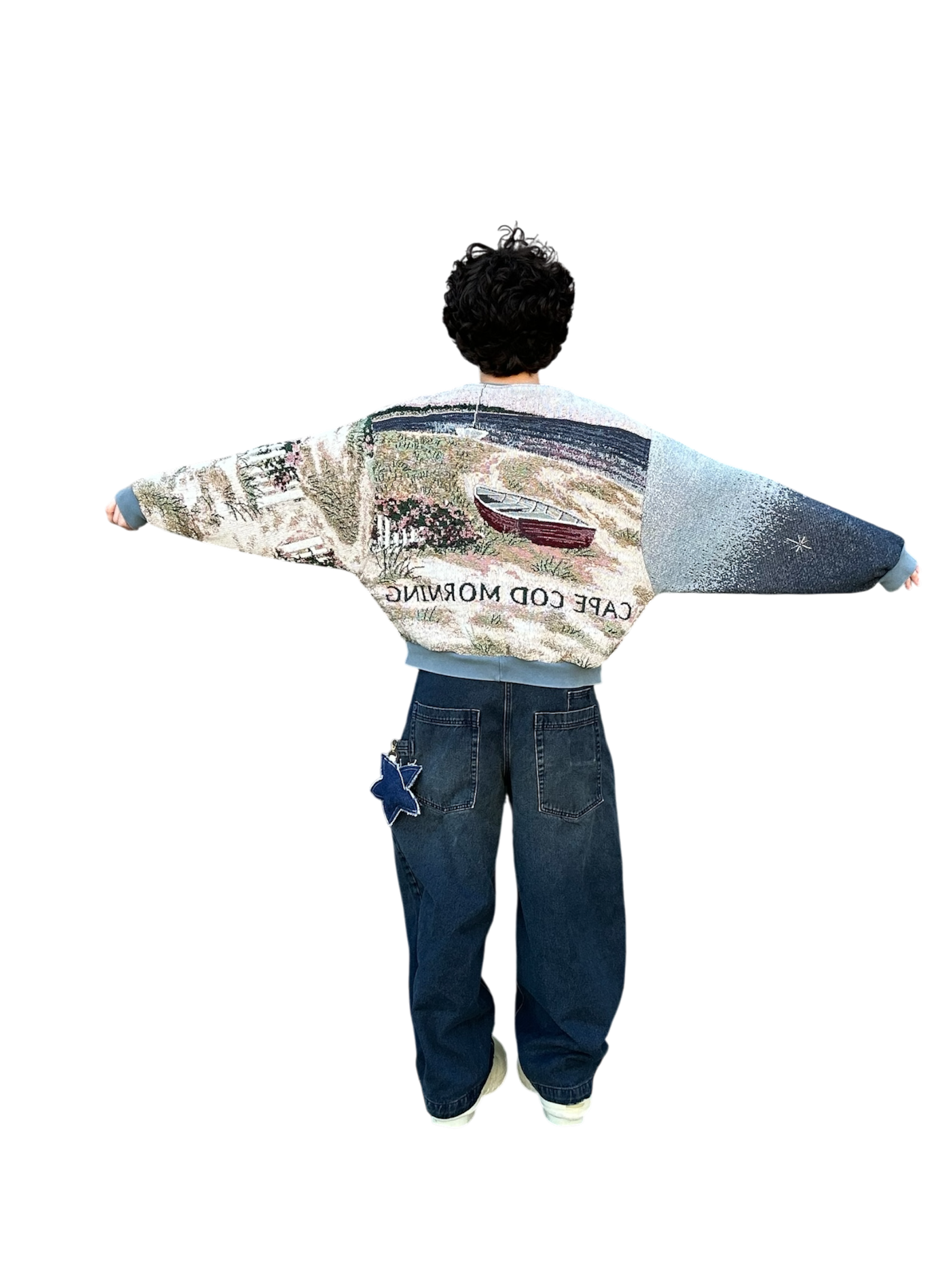 This oceanside themed sweatshirt is made from a beautiful tapestry blanket. The scenery of this sweatshirt depicts a small, flowery brick house on a sandy beach shore. “Cape Cod Morning” is written on the back of the sweatshirt under boats and a beautiful morning sky. This piece features beautiful visuals, colors, and a comfortable baggy fit. The fabric may have small catches/imperfections due to it’s preloved nature.
