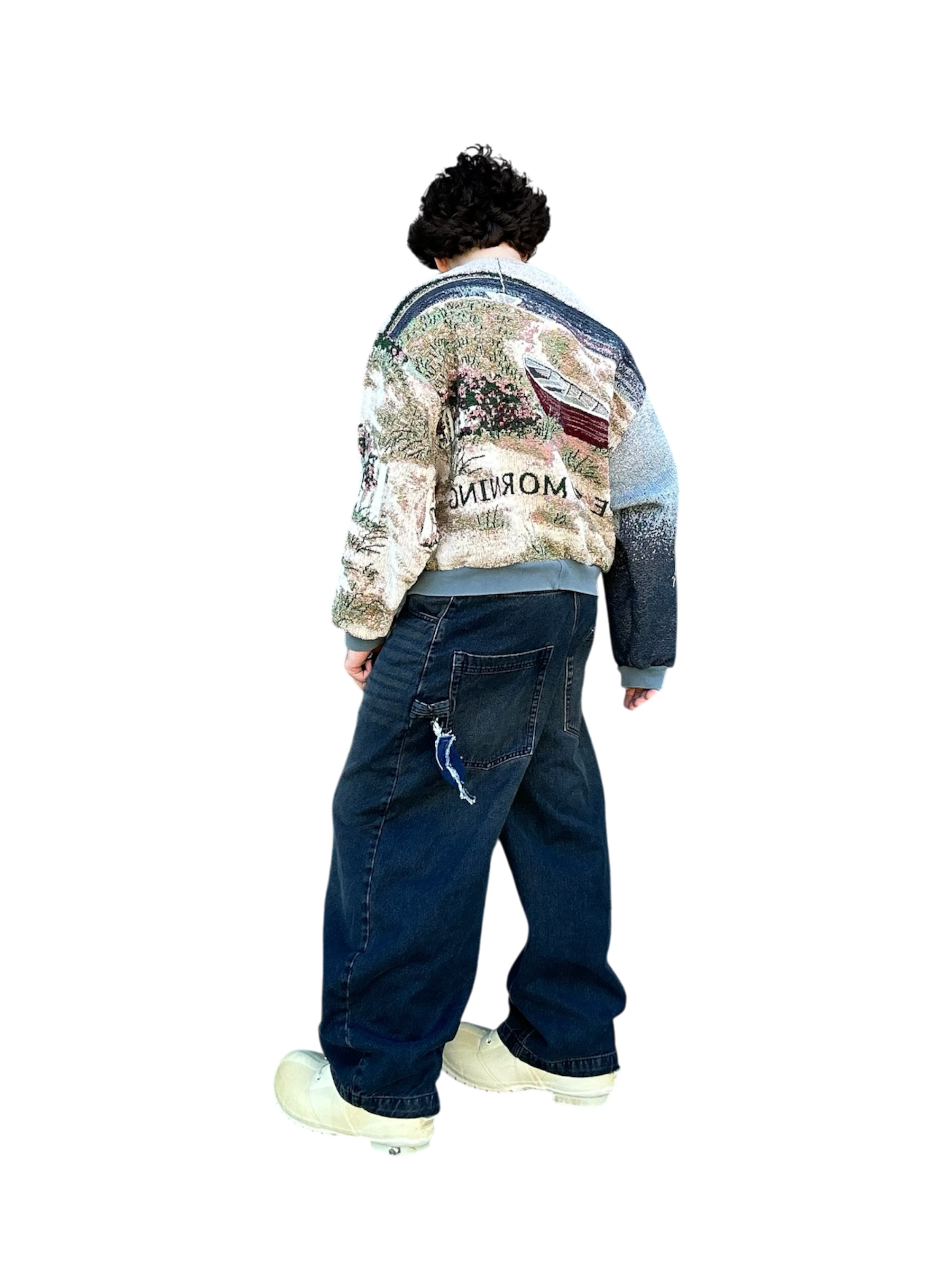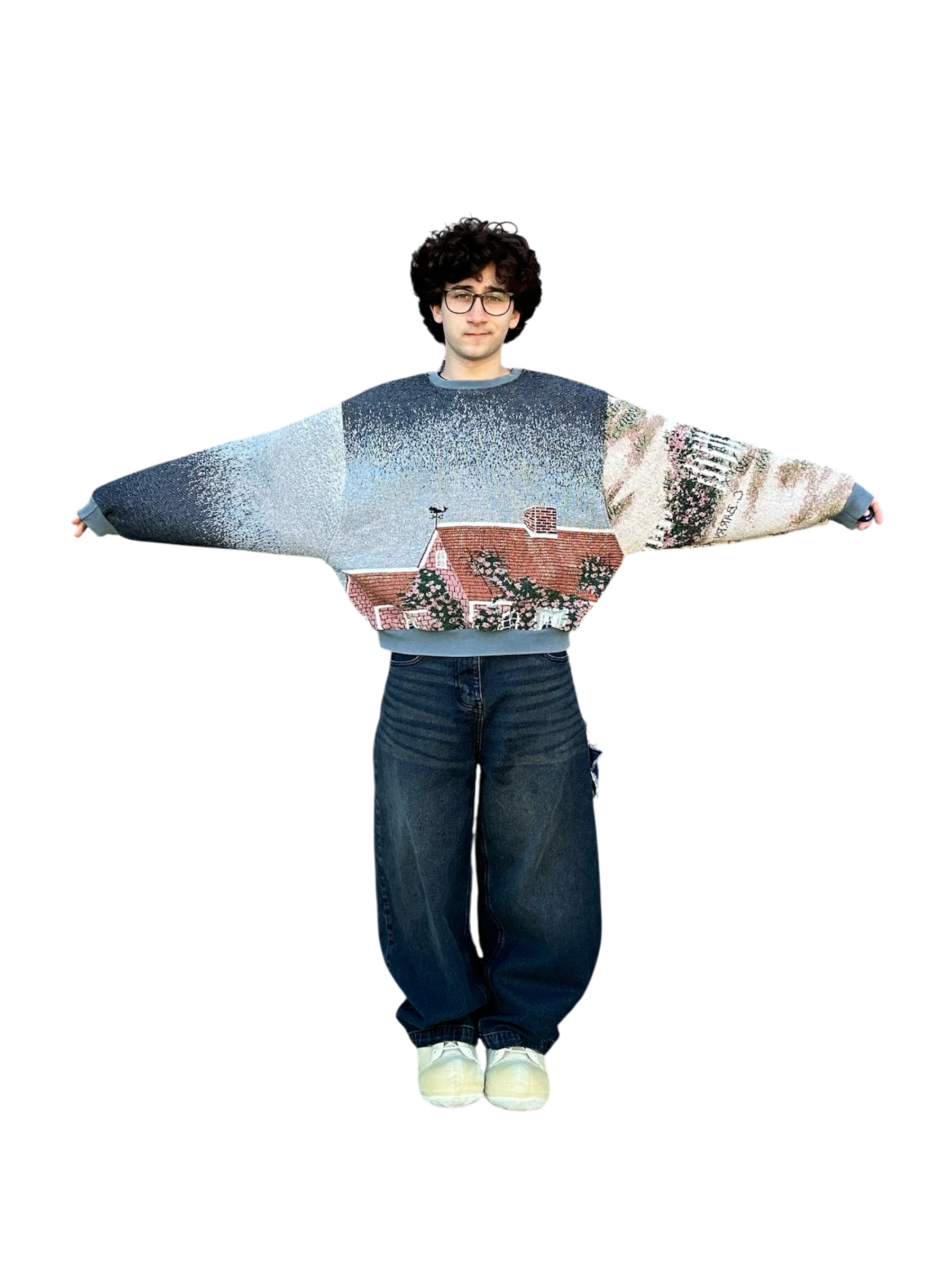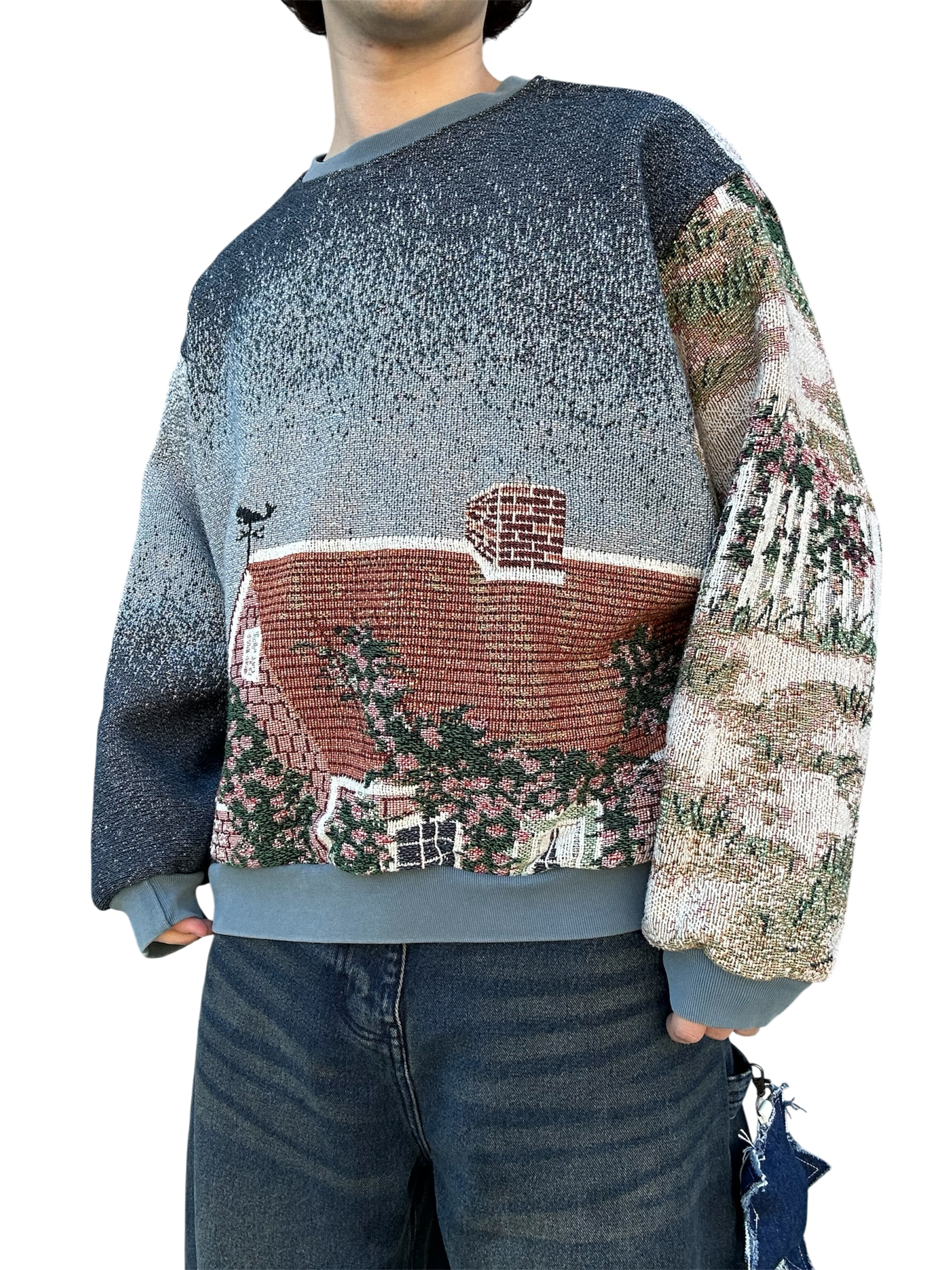 This oceanside themed sweatshirt is made from a beautiful tapestry blanket. The scenery of this sweatshirt depicts a small, flowery brick house on a sandy beach shore. “Cape Cod Morning” is written on the back of the sweatshirt under boats and a beautiful morning sky. This piece features beautiful visuals, colors, and a comfortable baggy fit. The fabric may have small catches/imperfections due to it’s preloved nature.
