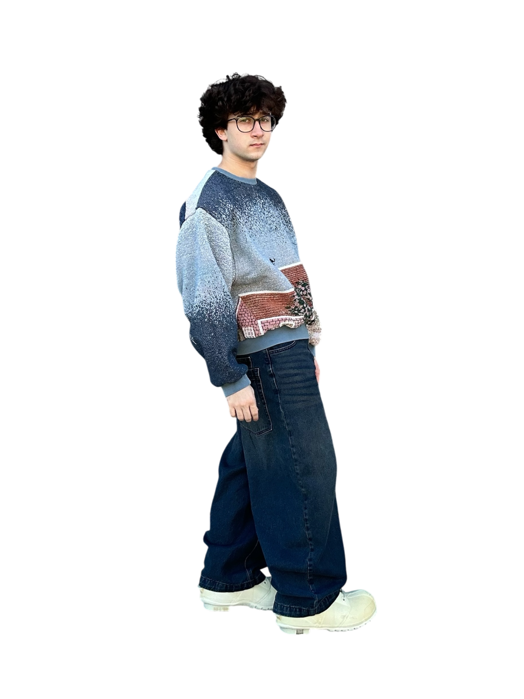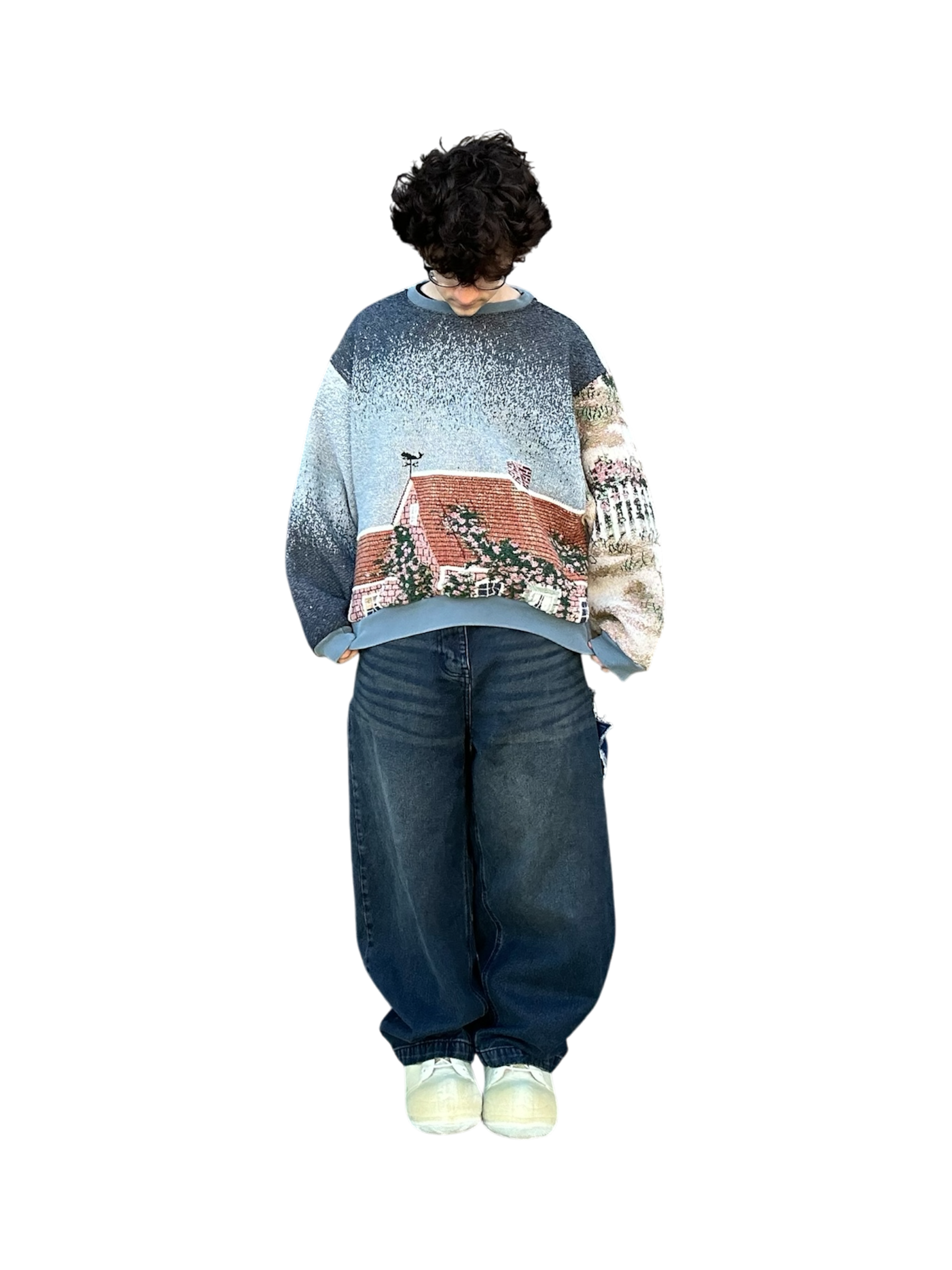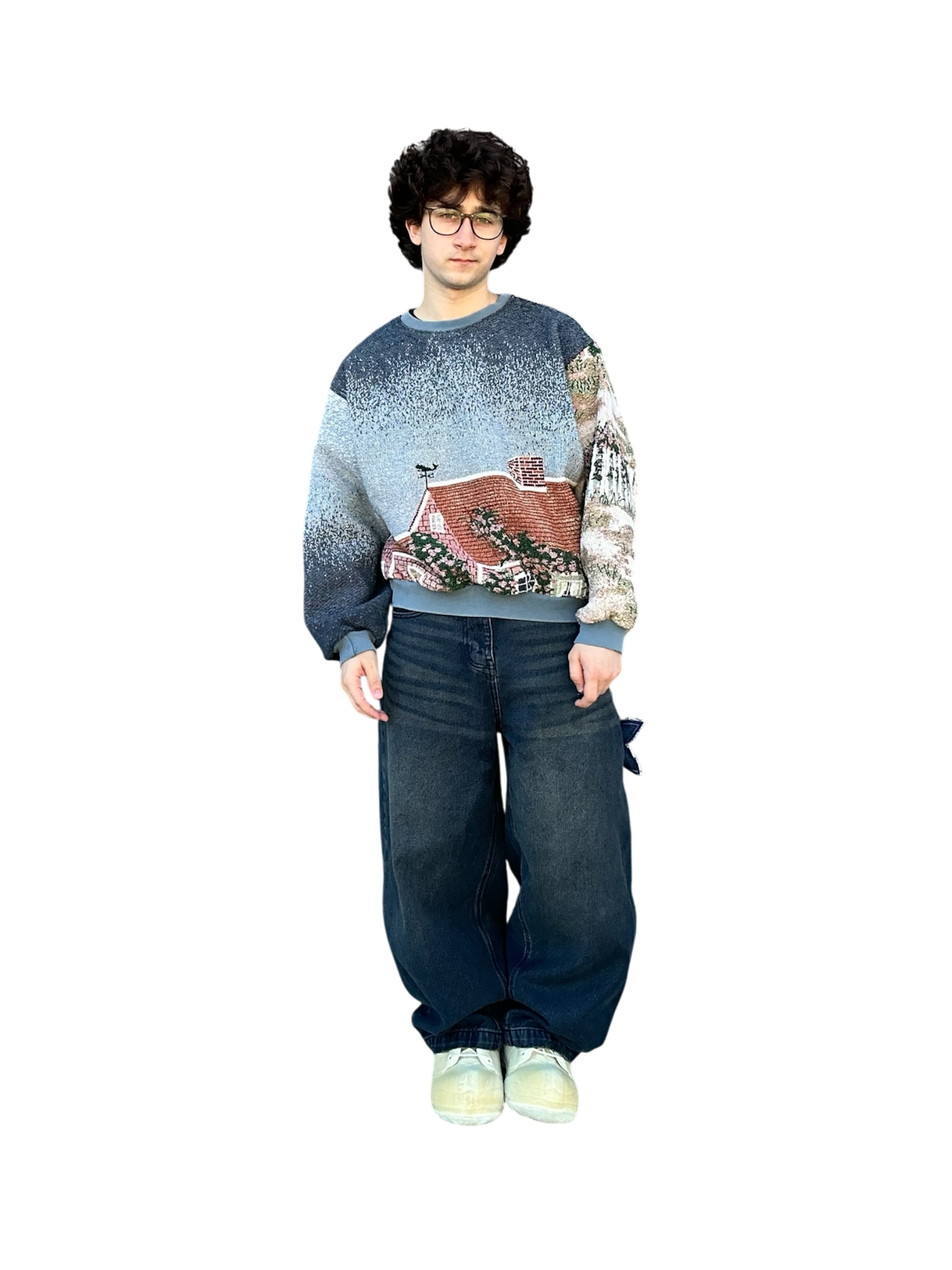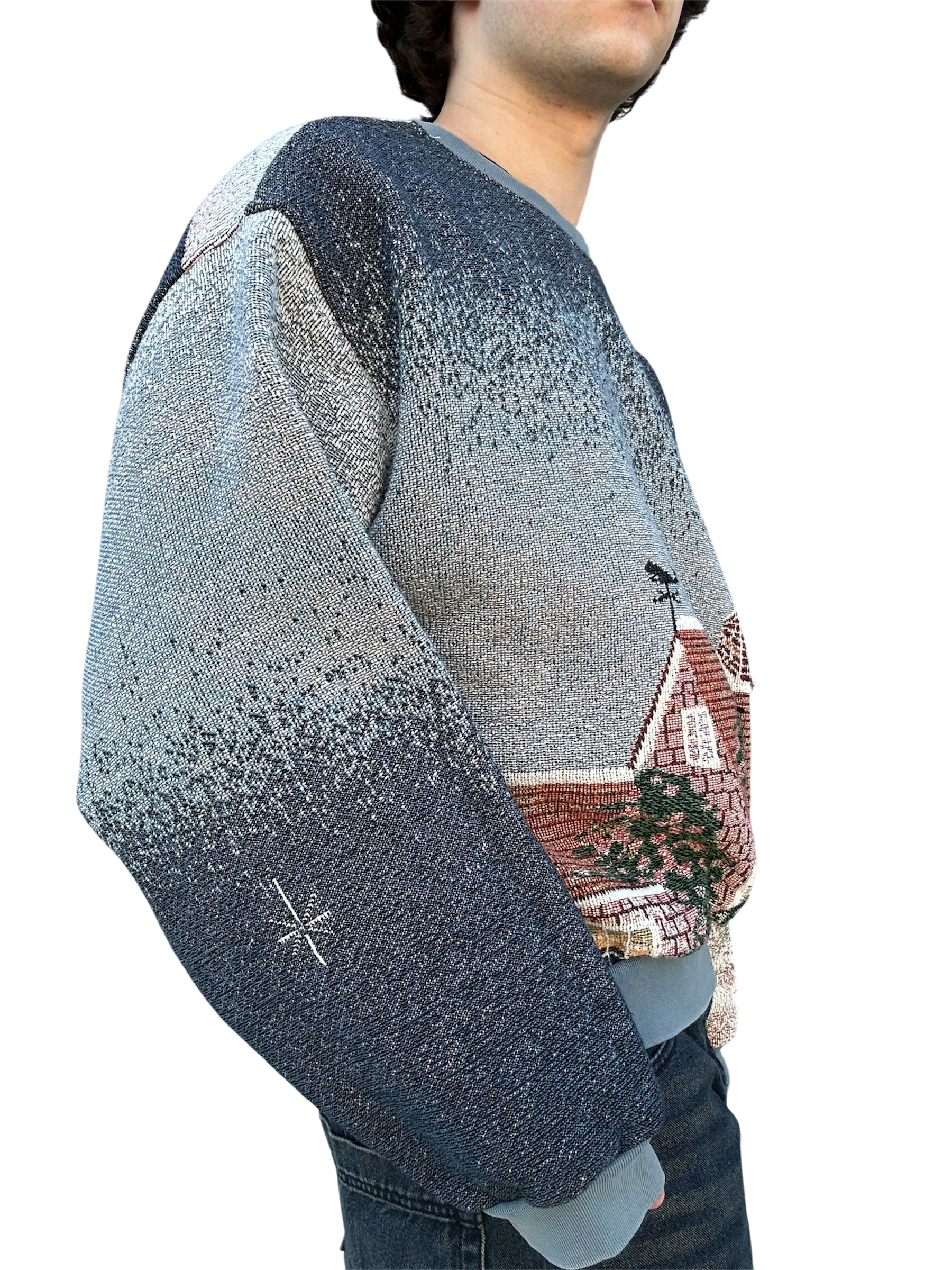 This oceanside themed sweatshirt is made from a beautiful tapestry blanket. The scenery of this sweatshirt depicts a small, flowery brick house on a sandy beach shore. “Cape Cod Morning” is written on the back of the sweatshirt under boats and a beautiful morning sky. This piece features beautiful visuals, colors, and a comfortable baggy fit. The fabric may have small catches/imperfections due to it’s preloved nature.