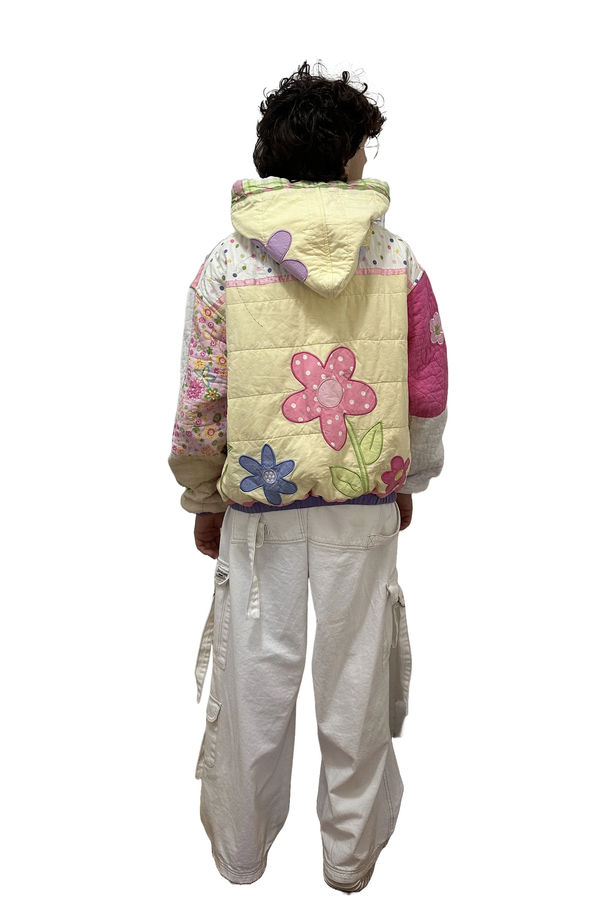 This hoodie was crafted from a pre-loved kids blanket. Take a trip down memory lane… or memory flower fields with this hoodie! This hoodie features a bursts of colors, two front floppy pockets, and a purple elastic waistband & cuffs! Let this hoodie carry your heart, and please, keep your childhood blankets, they love you too.